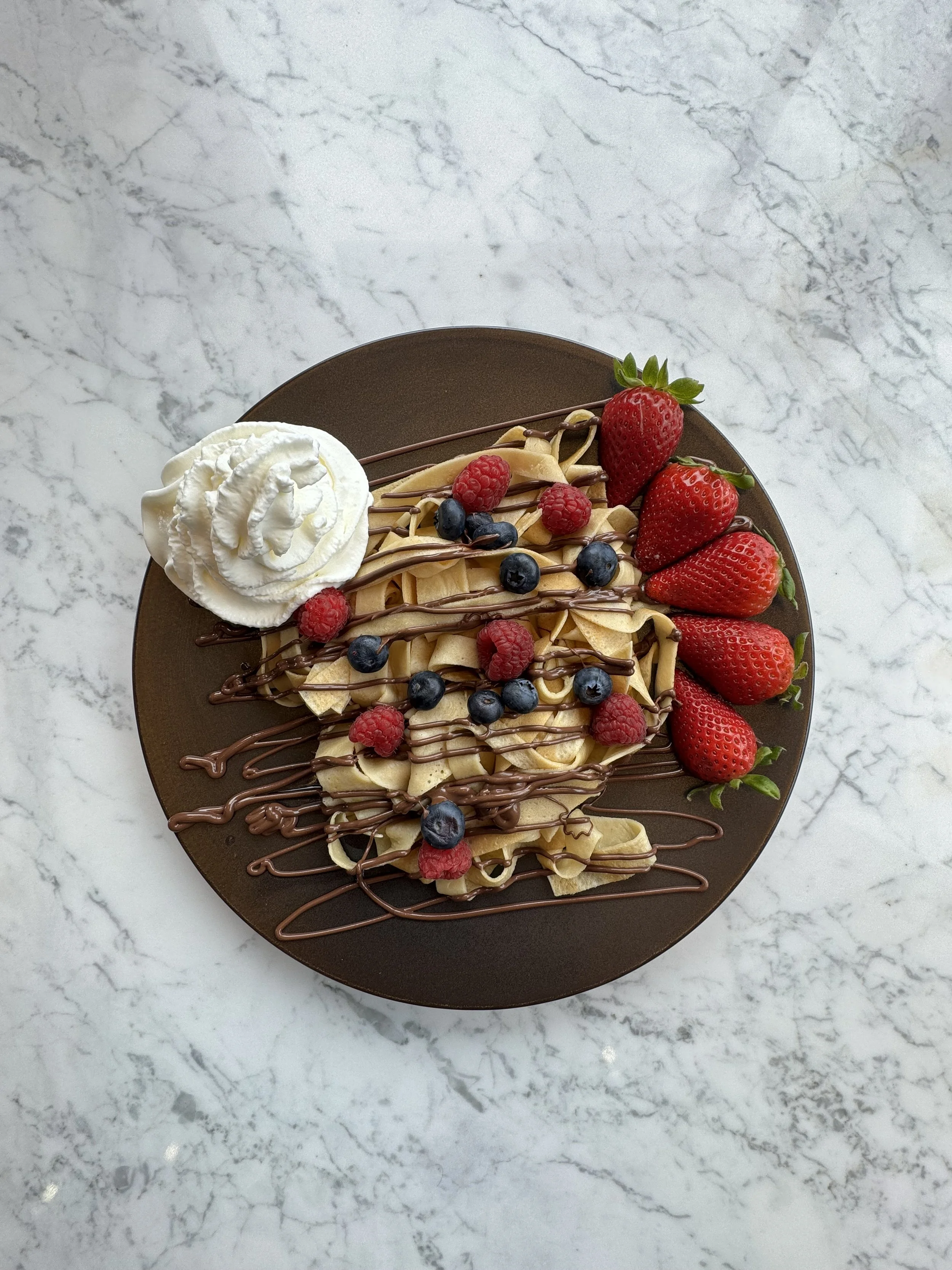 A delightful mix of blueberries, strawberries, and raspberries topped with a drizzle of Nutella and a dollop of whipped cream.