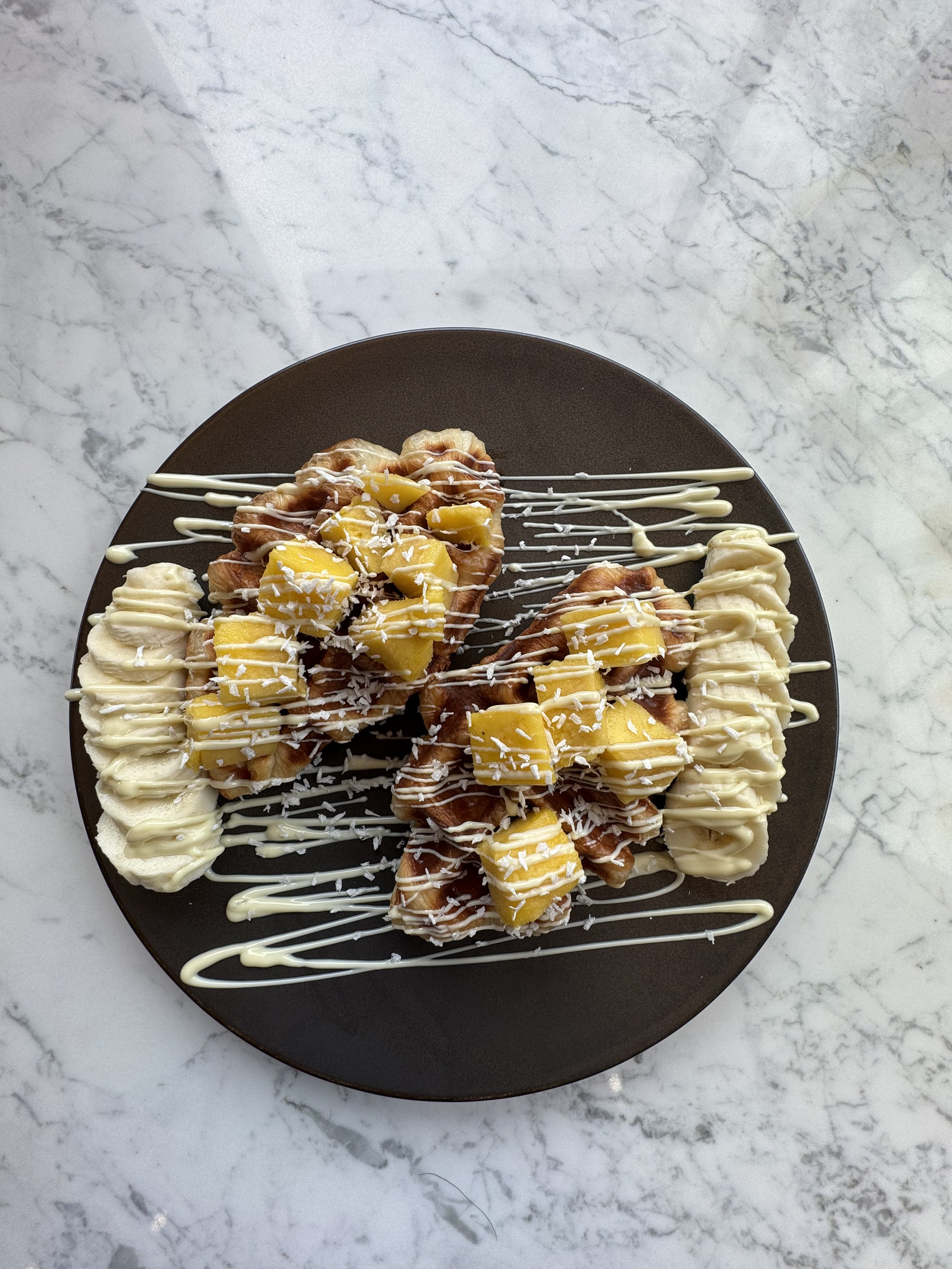 Sliced banana, creamy mango, finished with a sprinkle of shredded coconut and a drizzle of white chocolate sauce.