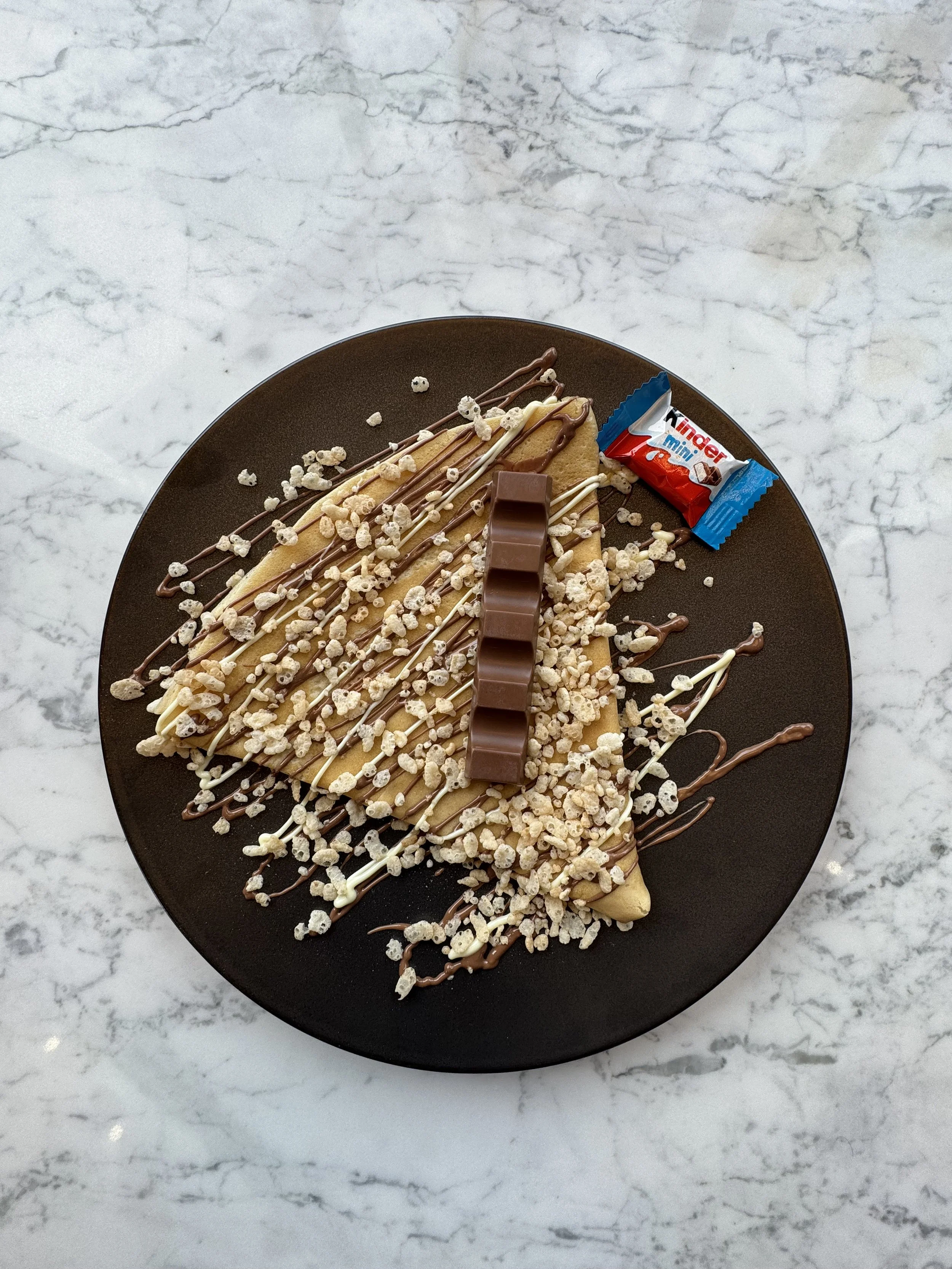 A childhood favourite featuring Kinder chocolate pieces, Rice Krispies for texture, and a drizzle of milk chocolate, finished with a Kinder on top for an extra treat.
